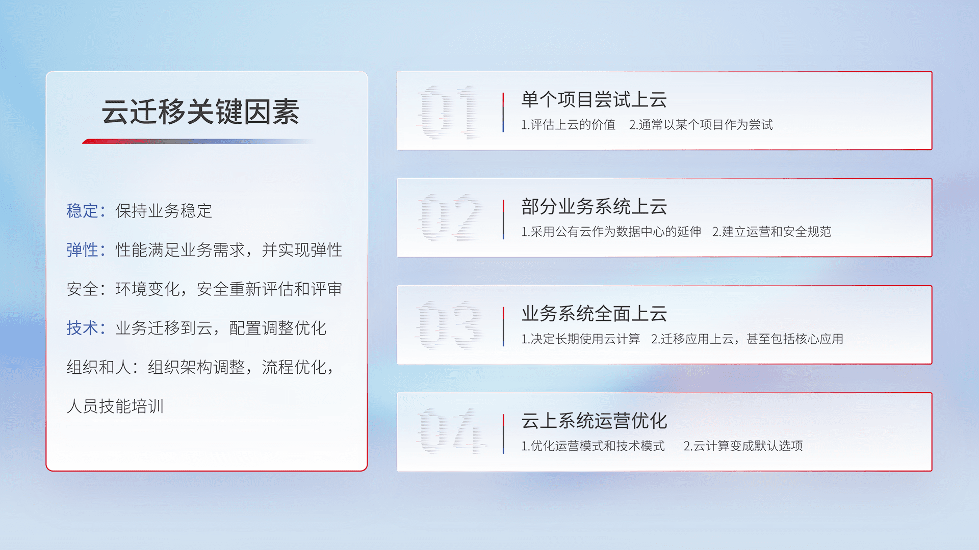 结合实际业务,,,从规划设计、、、云平台选型、、、、云原生改造、、、数据迁移、、集成交付,,迁移全过程为客户识别最佳上云路径,,,,做好风险识别管理,,设计网络架构、、、、身份权限、、、安全审计合规、、、、操作审计、、日志审计、、监控告警策略、、多站点容灾设计等,,,对云上基础设施进行整体规划,,,提升IT治理水平,,以满足弹性、、、、高可用、、高性能的需求。。